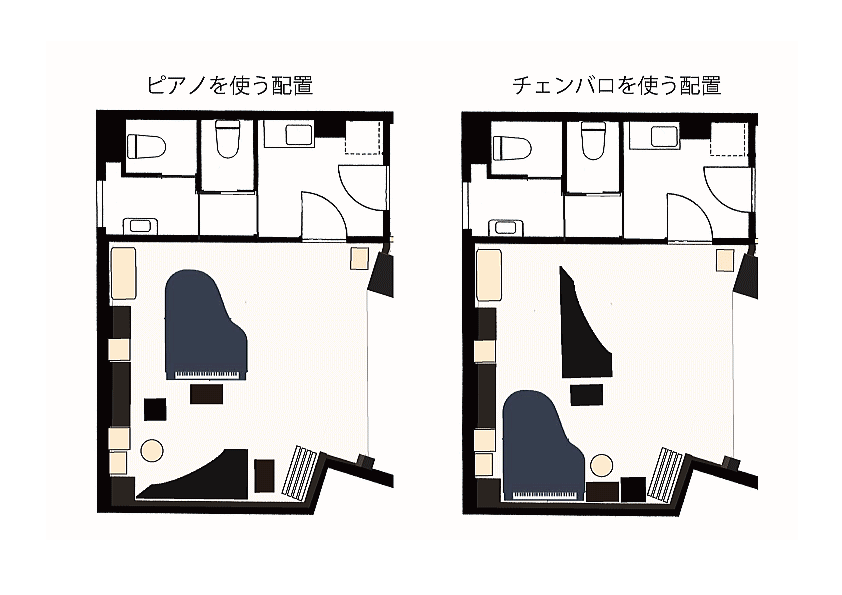 | チェンバロを使う場合は、ピアノをチェンバロと平行に左奥に収納します | ピアノを使う場合は、チェンバロをピアノと直角に左奥に収納します |