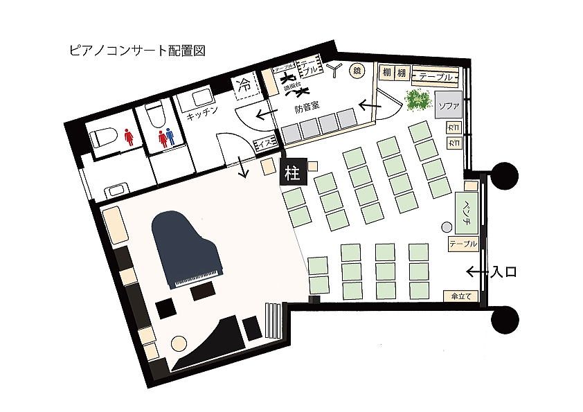 | グランドピアノ(ヤマハ C5X)・補助ペダル | 1 | 会議テーブル(60*120) | 4 | 客席イス(緑) | 28 |
